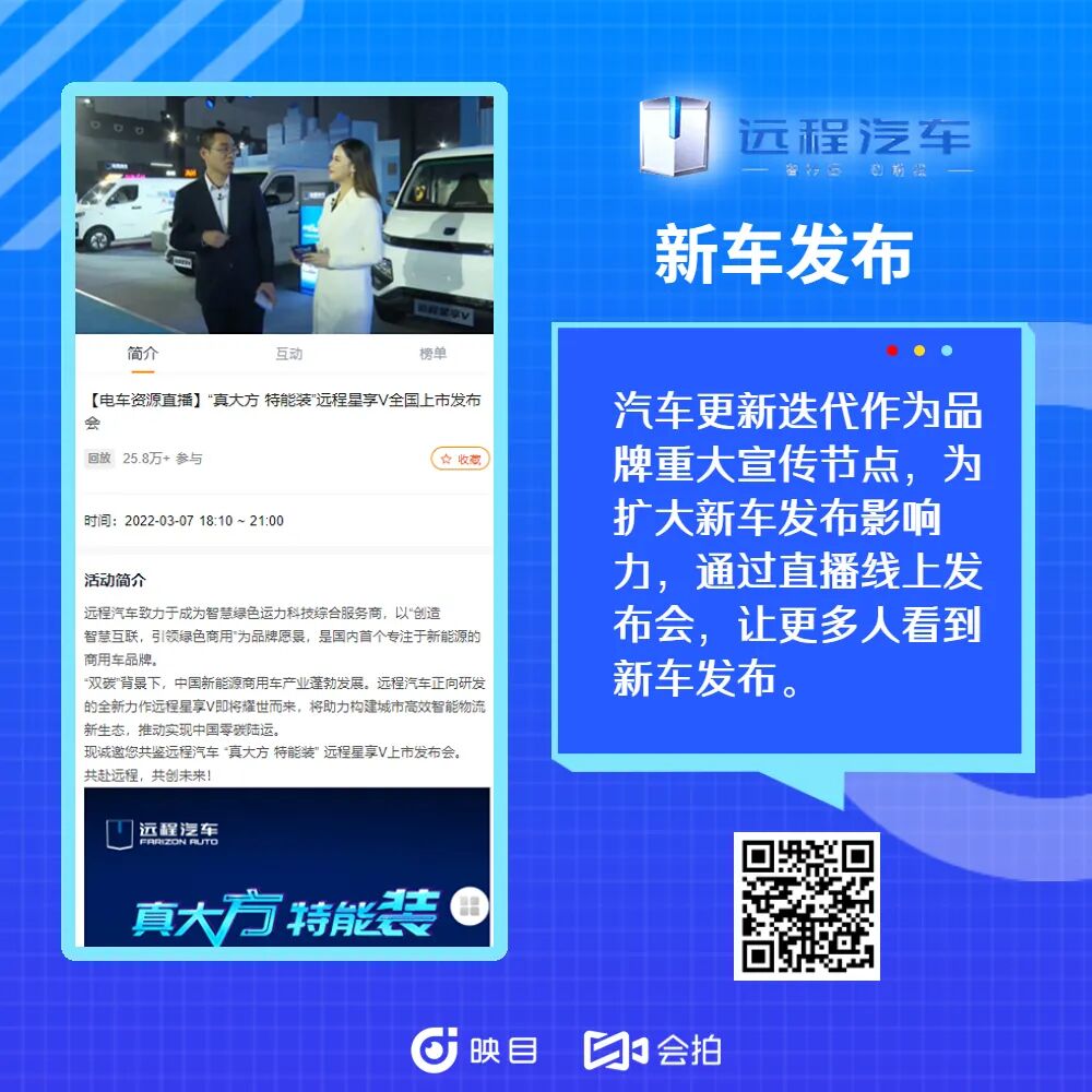 新品汽车发布,是展现汽车品牌魅力和研发实力的最佳时机,作为品牌宣传的重大节点,一场精心准备的发布活动,在直播上可不能有任何差错,映目提供从平台到拍摄一站式在线发布会全流程服务,具备高并发、低延迟、零卡顿、同声传译等优势,满足企业多端观看,多页面嵌入的需求,专业摄像导播,支持与异国车企总部连线直播,专人对接线上分发和执行人员,提升活动举办效率。